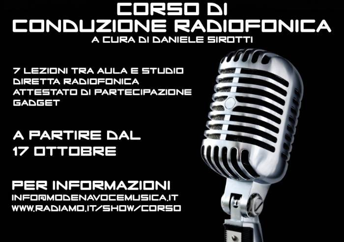 Con Modena Voce Musica A.P.S. (www.modenavocemusica.it) e Radiamo Web Radio (www.radiamo.it) diventare un conduttore radiofonico è alla portata di tutti. Un corso aperto a chiunque, per chi ha curiosità, passione, desiderio di provare, ma non sa come fare, questa è un’occasione unica sul territorio modenese. Questo corso di Conduzione Radiofonica vuole essere il tuo punto di partenza per entrare nel mondo della radiofonia. Oltre ad apprendere le tecniche di base, ma soprattutto un corretto ed efficace uso della voce nella conduzione radiofonica, gli speakers ed i professionisti che attualmente lavorano a Radiamo Web Radio, saranno a disposizione dei corsisti per un confronto ed un aiuto negli esercizi pratici e nelle prove di registrazione. Lezioni teoriche, ma anche simulazioni al microfono in un vero studio radiofonico ed alla fine di tutto l’occasione di mettere in pratica gli insegnamenti ricevuti e di parlare in radio conducendo un’ora di diretta su Radiamo Web Radio. Il corso teorico-pratico sarà diretto da Daniele Sirotti, noto attore modenese ed esperto di scherma teatrale presso la “Scuola d’Armi Musumeci Greco” di Roma; preparatore artistico per varie Associazioni; docente di dizione italiana e public speaking. In studio di registrazione, oltre alla presenza del docente Daniele Sirotti, i partecipanti saranno seguiti dal direttore artistico di Radiamo Web Radio Luca Bagnoli ed in regia audio da Federico Orri.