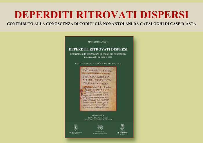 Domenica 7 Aprile alle ore 16 e 30 il Centro Studi Storici Nonantolani e l’Archivio Abbaziale di Nonantola presenteranno il libro di Matteo Malaguti “Deperditi ritrovati dispersi: contributo alla conoscenza di codici già nonantolani da cataloghi di case d’asta”. Il testo è preceduto dalla presentazione di Riccardo Fangarezzi, direttore dell’Archivio Abbaziale di Nonantola.