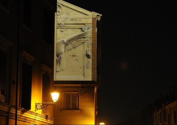 metallici da 150 W, che permette a coloro che percorrono la centralissima Rua del Muro nelle ore più buie, di ammirare in tutta la sua maestosa bellezza questo messaggio di pace per la nostra città e per il mondo.A Hera Luce, lo ricordiamo, è stata affidata dal Comune di Modena la riqualificazione dell’illuminazione pubblica nell’ambito del progetto MoPensaLed, ora in fase di conclusione, che ha interessato buona parte del territorio urbano, comprese zone del centro storico.