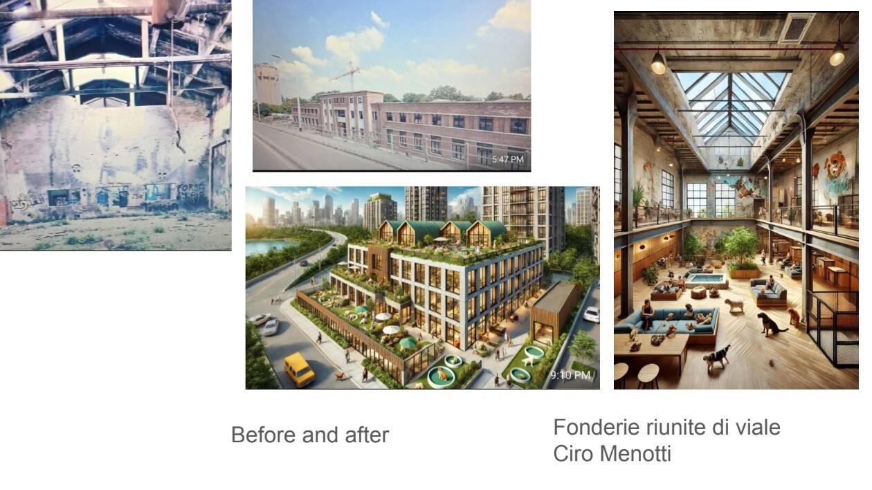 Matilde Fecchio per le Fonderie Riunite di Modena ha immaginato nuovi spazi dove natura e umanità si incontrano, con giardini e spazi animal friendly, aree gioco e spazi terapeutici per bambini, associando lo slogan 'Let's make this old sugar mill working, but this time modern and better - Where Nature and Humanity meet to make life for children and animals less difficult'.