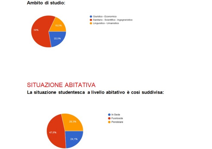 Si comincia con la situazione abitativa dove emerge che oltre il 38% di chi ha risposto è fuori sede e il 28% è composto da pendolari, quindi
