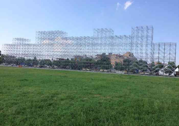 Il palco sarà come un palazzo di 8 piani rettangolare, largo 150 metri. 5 enormi schermi per oltre 1500 metri quadri di schermi : 1 centrale gigantesco piu’ altri 4 (due per parte) enormi. Si muoveranno su dei binari, separatamente o tutti insieme a formare le diverse videoscenografie (40) della regia in diretta. Altri schermi giganteschi saranno sparsi per il parco in maniera da agevolare la visione del concerto a tutti. E ancora: 29 torri di ritardo del suono.