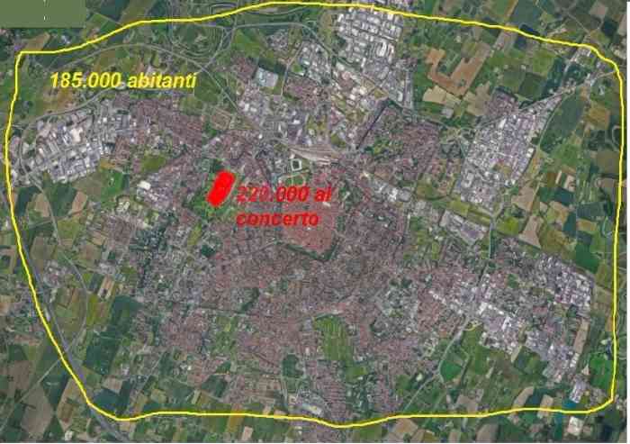 L'area urbana di Modena, delimitata in giallo, dove risiedono circa 185.000 persone e, in rosso, quella dove si concentreranno 220.000 persone per assistere al concerto del primo luglio. Basta una bozza rudimentale di piantina e due righe fatte a mano per dare l'idea che cosa significhi in termini di numeri e di spazi l'evento che Modena sta per ospitare. Sulla nostra pagina Facebook una marea di reazioni. Basta davvero questa piantina. E allora quel sì al concerto a due passi dal centro pronunciato da Muzzarelli un anno fa assume i contorni dell'improvvisazione e l'allarme lanciato dal direttore generale Ausl Annicchiarico appare più che motivato.