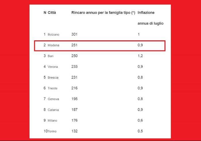 In base agli ultimi dati Istat sull'inflazione delle regioni e dei capoluoghi di regione e comuni con più di 150mila abitanti, l'Unione Nazionale Consumatori ha stilato la classifica delle città e delle regioni più care d'Italia, in base al costo della vita. Malissimo Modena che, secondo lo studio dell'associazione di consumatori, è seconda solo a Bolzano. A Modena il rialzo dei prezzi dello 0,9% determina un aggravio annuo di spesa, per una famiglia media, pari a 251 euro, terza Bari, dove l'inflazione a +1,2%, il primato di luglio, comporta una spesa supplementare pari a 250 euro.