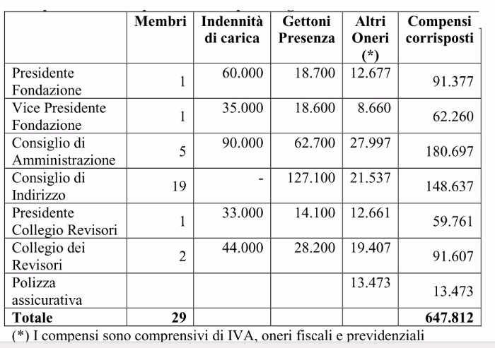 Solo per pagare i propri organi statutari la Fondazione spende infatti 647mila euro all'anno.