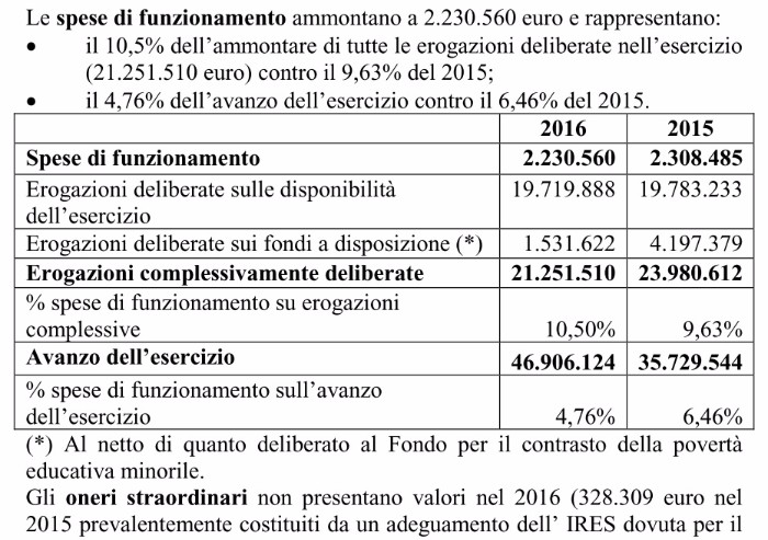 Numeri che comunque non hanno cambiato il profilo complessivo delle erogazioni, anche se il quadro dei finanziamenti al territorio è in calo rispetto al 2015. Nel 2016 infatti sono state deliberate erogazioni per 21 milioni e 251mila euro contro i quasi 24 milioni del 2015. In questo modo cresce anche il peso delle spese di funzionamento della 'macchina' della Fondazione: per mantenere se stesso l'ente guidato da Cavicchioli lo scorso anno ha speso 2 milioni e 230mila euro (esattamente il 10,5% di quanto erogato contro il 9,63% dell'anno precedente).