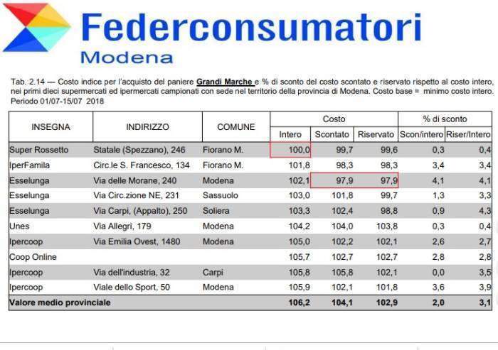 Nella tabella in alto la fotografia dei primi 10 supermercati e ipermercati per l'acquisto del paniere Grandi Marche. Sul podio la Super Rossetto di Fiorano. Per quanto riguarda la città di Modena prima la Esselunga di via Morane e all'ultimo posto dei 10 per quanto riguarda il prezzo intero l'Ipercoop I Portali di via dello Sport.