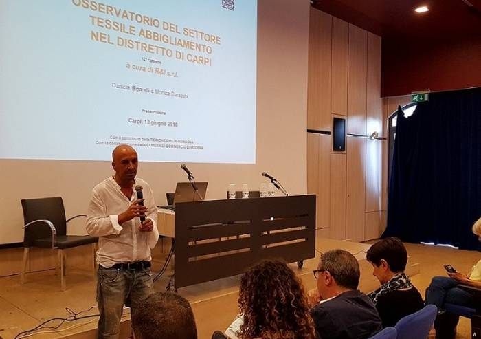 Un Distretto che presenta elementi di innovazione accanto ad alcune innegabili difficoltà, all’interno del quale sono in atto mutazioni significative, e una polarizzazione tra grandi aziende, con oltre 50 dipendenti, e piccole e piccolissime, maggiormente in difficoltà ma dotate sia di una forte vocazione all’innovazione di prodotto, che capaci di muovere i primi passi per ampliare la propria presenza sui mercati esteri: questa, in estrema sintesi, la fotografia del settore fornita dal 12° Osservatorio del settore tessile abbigliamento nel Distretto di Carpi, realizzato dall’Istituto di ricerca R&I e presentato ieri, mercoledì 13 giugno, all’Auditorium della Biblioteca Loria da Daniela Bigarelli, alla presenza, oltre che di imprenditori e associazioni di categoria, dell’assessore regionale alle Attività produttive Palma Costi, del Docente di Economia Industriale all'Università degli Studi di Parma Franco Mosconi e dell’assessore all’Economia del Comune di Carpi Simone Morelli (foto)