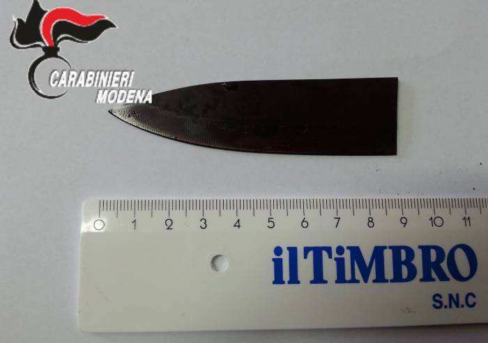Nella foto, fornita dai Carabinieri, è immortalta la lama che al Policlinico di Modena è stata estratta dalla spalla di un 36enne marocchino, residente a San Felice che solo per caso ha avuto salva la vita- Una lama conficcata durante una lite per dissidi famigliari dal cognato 41enne, anch'egli residente a San Felice. Entrambi dipendenti della ditta GSM, si erano violentamente scontrati propri nei pressi della ditta nella quale lavorano. Una lite accesa, nel corso della quale il 41enne ha estratto un coltello e l'ha usato contro il cognato sferrando colpi al viso e alla spalla. In uno dei colpi la lama è rimasta conficcata nel corpo dell'uomo. L'aggressore, che nel corso della collutazione aveva subito alcune lesioni al labbro, si è subito dato alla fuga, ma è stato arrestato poche ore dopo dal personale in borghese dei Carabinieri all'interno dell'ospedale di Mirandola dove l'uomo si era recato per farsi medicare una ferita al labbro provocata durante la collutazione. Dovrà rispondere di lesioni personali gravi. Il cognato è stato ricoverato d'urgenza al Policlinico di Modena dove i sanitari hanno estratto la lama e ufficializzato una prognosi, sciolta questa mattina, di 22 giorni.