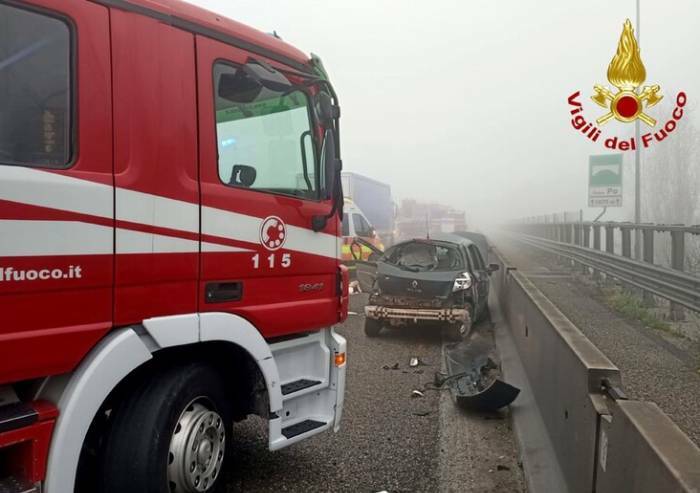 Si sono scontrati un'auto e almeno due mezzi pesanti, probabilmente a causa della nebbia