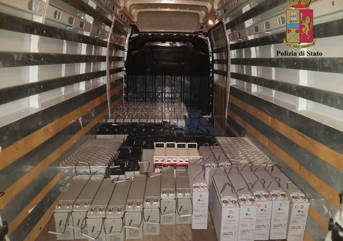 Il successivo controllo del mezzo ha permesso di rinvenire nel vano di carico ben 83 batterie del tipo utilizzato per l’alimentazione dei ponti radio della telefonia mobile, del valore di circa 20.000 euro. I due provenienza e possesso i due non sono stati in grado di fornire alcuna convincente spiegazione. Elemento che fonda il sospetto della provenienza delittuosa della merce.