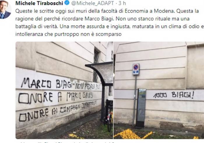 Aggiunge Andrisano: 'Evocare i fatti di 16 anni fa con disprezzo per il sacrificio del nostro docente e' un atto di incivilta'. Confidiamo che le forze dell'ordine possano individuare i responsabili di questo gesto indegno'. Era stato un allievo di Biagi e oggi docente Unimore, Michele Tiraboschi, a segnalare pubblicamente il fatto delle scritte. 'Queste le scritte oggi sui muri della facolta' di Economia a Modena. Questa la ragione del perche' ricordare Marco Biagi. Non uno stanco rituale ma una battaglia di verita'. Una morte assurda e ingiusta, maturata in un clima di odio e intolleranza che purtroppo non e' scomparso', ha scritto Tiraboschi stamattina su twitter pubblicando anche le foto. Alla segnalazione di Tiraboschi e' seguito rapidamente il commento del segretario nazionale della Fim-Cisl, Marco Bentivogli: 'Pena e vergogna per chi inneggia all'uccisione di un uomo coraggioso e giusto e ai vigliacchi che gli hanno tolto la vita. Il terrorismo e' nemico dei lavoratori e delle loro battaglie'