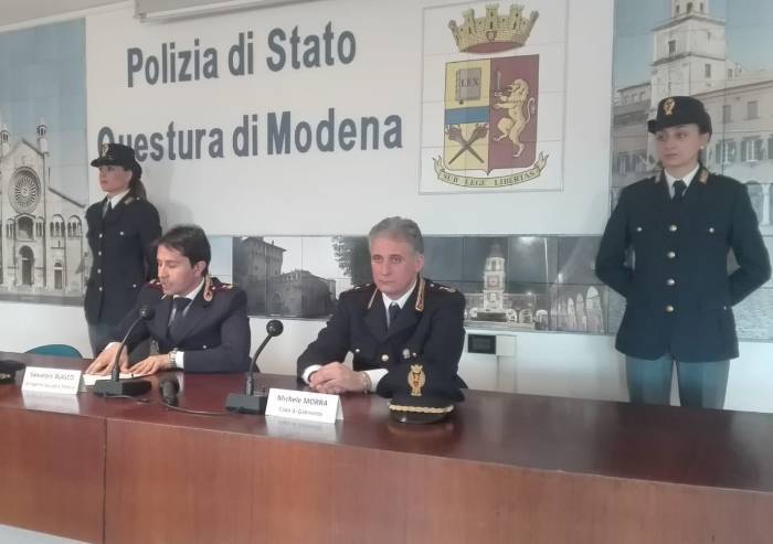 Nella foto, da sinistra, Salvatore Blasco, Dirigente Capo della Squadra Mobile di Modena ed il Capo di Gabinetto della Questura, Michele Morra nel corso della conferenza stampa sui particolari delle indagini e dell'attività che ha portato all'arresto del malvivente