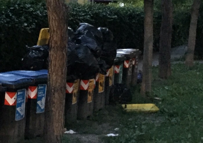I residenti hanno segnalato ripetutamente il disservizio ma con scarsi risultati. Anche questa sera i bidoni versavano in queste condizioni.