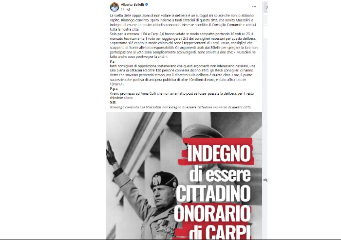'La scelta delle opposizioni di non votare la delibera è un autogol, mi spiace che non lo abbiano capito. Rimango convinto, spero insieme a tanti cittadini di questa città, che Benito Mussolini è indegno di essere un nostro cittadino onorario. Ne esce sconfitto il Consiglio Comunale e con lui tutta la nostra città - afferma il sindaco Bellelli sui social -. Solo per la cronaca: il Pd e Carpi 2.0 hanno votato in modo compatto portando 16 voti su 25, è mancato tecnicamente 1 voto per raggiungere i 2/3 dei consiglieri necessari per questa delibera. Soprattutto si è capito in modo chiaro chi sono i rappresentanti di Carpi Futura, consiglieri che scappano di fronte alle loro responsabilità. Gli argomenti usati dai 5Stelle per spiegare la loro non partecipazione al voto sono semplicemente sconvolgenti, sono arrivati a dire che: Mussolini ha fatto anche cose positive per la città'.
