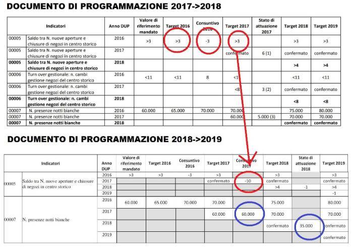 'Per il 2016 il Comune aveva previsto un saldo positivo maggiore di 3, ovvero: 3 negozi aperti in più rispetto alle chiusure. Ma a fine anno ci siamo trovato con 3 negozi in meno. Differenza -6. Per il 2017 il Comune aveva previsto sempre 3 negozi in più. Ma le chiusure, invece, sono state 10 in più delle aperture. Saldo negativo 10, differenza rispetto agli obiettivi del Comune -13. Significativo poi il dato delle presenze alle Notti bianche: che vengono sempre annunciate come 60-70000 anche quando sono 5000. Perché questi annunci? Perché a fine anno deve quadrare anche il totale delle presenze, come riportato nel Dup, altrimenti i soldi spesi non sono giustificati'.