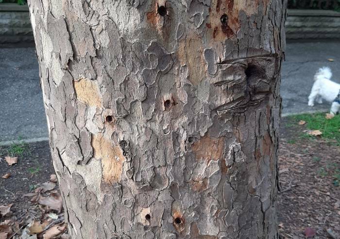 Il servizio di gestione dei parchi del Comune ha prontamente visionato il platano accertando una serie di evidenti buchi nella zona del tronco presumibilmente effettuati da trapano. Il fusto presenta anche scortecciamenti di recente realizzazione causati, molto probabilmente, con un’accetta.