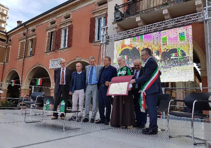 Una piazza Garibaldi gremita ha salutato, questo pomeriggio, la cerimonia di consegna della Cittadinanza Onoraria a Padre Sebastiano Bernardini, votata all’unanimità dal Consiglio Comunale di Sassuolo, e consegnata ufficialmente oggi in una festa in piazza per salutare e ringraziare il motore e l’artefice di tante iniziative cittadine, prima fra tutte il Ricreatorio san Francesco. Hanno voluto salutare Padre Sebastiano il Presidente del Sassuolo Calcio Carlo Rossi, don Giovanni Rossi, il Direttore della Casa Francesco e Chiara di Pavullo Rino Bellori, Alberto Ansaloni che ha consegnato a nome del padre un ricordo per quanto fatto da Padre Sebastiano anche in ambito extracalcistico, oltre ad uno di coloro che Sebastiano definisce “i miei cannibali”: i ragazzi dell’allora Ricreatorio san Francesco Nano Casarotti. Non è voluta mancare alla festa, sebbene con un video saluto, anche colei che dal Folletto D’Oro organizzato da Padre Sebastiano iniziò una carriera che ancora oggi è tra le più brillanti: quella Caterina Caselli che, all’apice del successo, in un’intervista Rai ebbe a ricordare: “Ora che sono famosa tutti mi cercano, quando avevo bisogno e non mi conosceva nessuno l’unico che mi aprì le porte fu Padre Sebastiano da Sassuolo”. Il Sindaco di Sassuolo Claudio Pistoni ha letto pubblicamente
