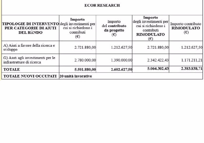 La delibera Regionale 334 del 20 Marzo 2017 fissa gli importi destinati alle 15 aziende che in Regione hanno ottenuto il placet, a tra queste la ECOR RESAERCH ottiene il finanziamento di quasi 2,4 milioni di euro (circa il 50% del totale) dalla nostra Regione.