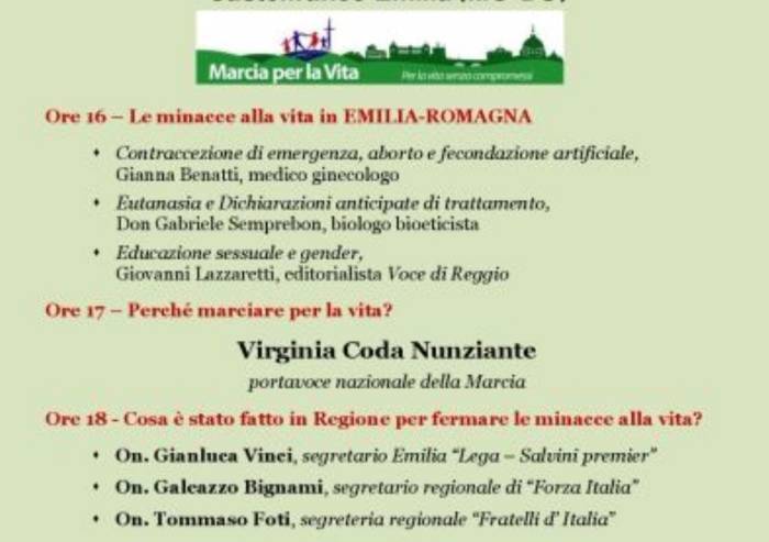 Sabato 9 febbraio al Cinema Nuovo di Castelfranco Emilia dalle 16 alle 19 incontro dei movimenti pro-life emiliani. La portavoce della Marcia nazionale della Vita, Virginia Coda Nunziante, parlerà della 'marcia per la vita' organizzata sui temi di aborto, pillola del giorno dopo, fivet, eutanasia e educazione sessuale abortista. All'incontro saranno presenti i tre segretari regionali di Forza Italia, Fdi e Lega, Bignami, Foti e Vinci. L'iniziativa nel carpigiano è promossa da Giorgio Cavazzoli, che annuncia così la sua candidatura al Consiglio Comunale di Carpi alle elezioni di maggio.