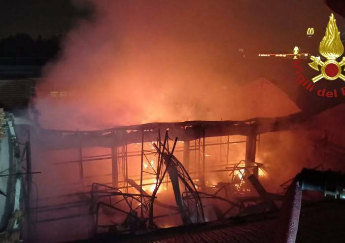 All'una e trenta allarme in via Pacinotti. Nessuna persona coinvolta. Le fiamme hanno avvolto 600 metri quadrati, provocandone il crollo parziale
