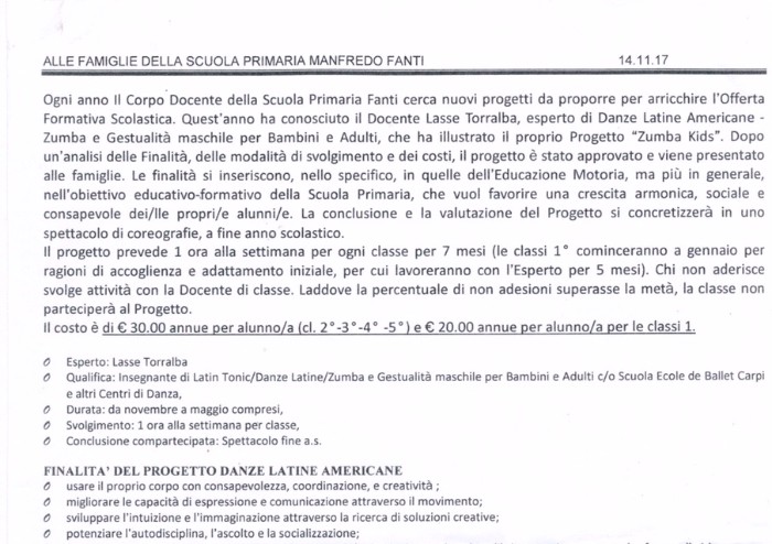 'Purtroppo con il caos che c'è stato - per colpa di poche mamme in crisi mistica che hanno fatto leva, in malafede, sulla sostituzione delle ore di religione e invocato la scomunica papale - la sperimentazione partirà solo a gennaio e chi aveva già iscritto i bambini dovrà ripetere l'iscrizione. Queste mamme non capiscono che è importante che i bambini, spesso chini su libri, PC, tablet e altro siano sempre più distolti da scrivanie e monitor e siano incentivati a divertirsi facendo attività fisica. La Zumba può essere la prima di diverse sperimentazioni di questo genere - continua Benatti -. Come detto, la Zumba non sostituirà affatto le ore di religione. Ma anche se così fosse, non ci vedrei tutto questo scandalo.