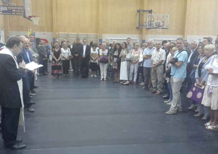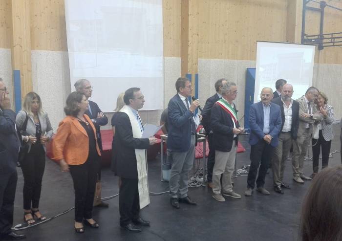 Taglio del nastro questa mattina in occasione di apertura dell'anno scolastico dell'istituto Galilei di Mirandola, ricostruito dalla Provincia di Modena, al posto del vecchio edificio demolito dopo il sisma.