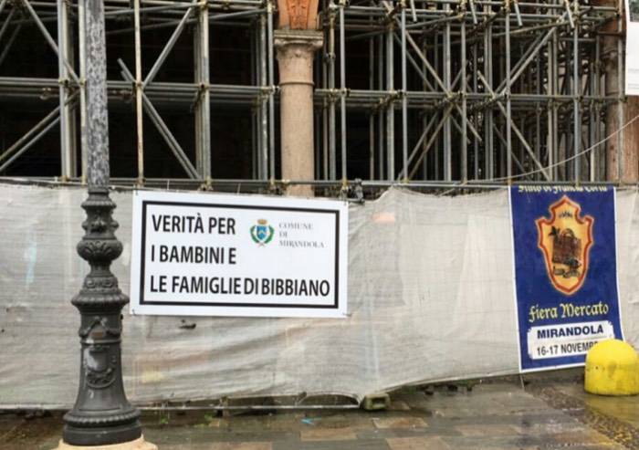 ‘Verità per i bambini e le famiglie di Bibbiano’, questa la frase che campeggia sul cartellone affisso in piazza Costituente a Mirandola di fronte al Municipio, con tanto di logo del Comune.