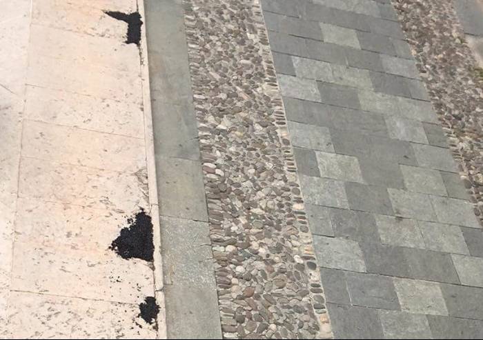 Il marmo dei marciapiedi del centro rattoppato col bitume. Succede a Mirandola, patria dei Pico e Comune capofila della Bassa. Un insulto al concetto di bello, ma anche solo di buonsenso, che il consigliere comunale di Forza Italia, Marian Lugli, sottolinea con forza.