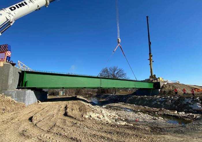 Il ponte sul torrente Guerro, lungo quasi 40 metri e largo 11,20 metri con le spalle in cemento armato, è in fase di completamento grazie alla posa delle travi che consentiranno la realizzazione della struttura stradale.