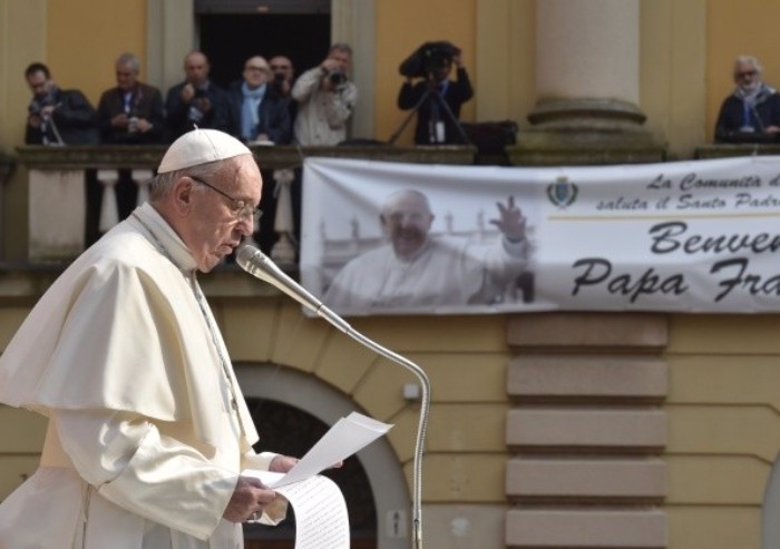 Dopo la prima tappa della visita a Carpi, Papa Francesco si è recato a Mirandola dove è stato accolto da un bagno di folla. Accompagnato dal Vescovo della diocesi di Carpi Francesco Cavina, il Pontefice si è recato all'interno della cattedrale cittadina ancora inagibile, e circondata da impalcature, deponendo una corona di fiori sull'altare principale, in onore ed in memoria delle vittime. Uscito dal Duomo, sul palco allestito nell'area del sagrato che si affaccia, sulla piazza, Papa Francesco ha pronunciato il seguente discorso: