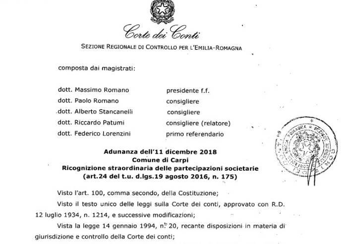 Sono stati depositati una settimana fa nella segreteria del Comune di Carpi i rilievi della Corte dei Conti sulle Partecipate del Comune di Carpi. Una delibera articolata e che muove all'ente guidato da Alberto Bellelli una serie di rilievi sottolineando diverse criticità. La Pressa propone in anteprima una ampia sintesi.