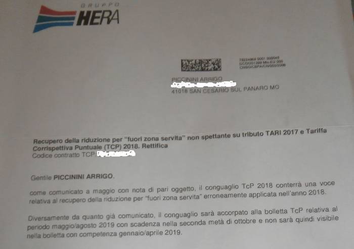'Se la modalità di raccolta 'porta a porta' è a discrezione dell'utente perchè per Hera il recupero della riduzione per 'fuori zona servita' è invece obbligatorio? Alle famiglie che non hanno scelto la modalità di raccolta 'porta a porta' è stata comunque fatta pervenire la lettera per il recupero degli arretrati della della tassa sui rifiuti, dal 1 luglio 2017 al 31.12.2018. Anche se queste famiglie non hanno mai visto un mezzo adibito alla raccolta dei rifiuti 'porta a porta', mai ricevuto un calendario degli svuotamenti, in quanto avevano scelto, avendone la facoltà, di conferire i rifiuti ad un cassonetto posto a più di 300 metri dalla loro abitazione. Quindi come previsto dal regolamento comunale, al momento della redazione delle fatture, spettava loro la riduzione della tariffa nella misura del 40%. Lo scorso 21 agosto ho esposto le mie osservazioni al direttore dei servizi ambientali di Hera, Antonio Dondi, ma ad oggi non ho avuto alcuna risposta. Per quale ragione una famiglia deve perdere la riduzione per 'fuori zona servita' a seguito dell'introduzione del servizio di raccolta 'porta a porta', quando, in realtà, di questo servizio ha mai usufruito?' - chiude la Piccinini.