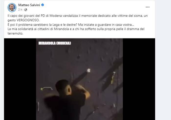 'Il capo dei giovani del Pd di Modena vandalizza il memoriale dedicato alle vittime del sisma, un gesto vergognoso. E poi il problema sarebbero la Lega e le destre? Ma iniziate a guardare in casa vostra… La mia solidarietà ai cittadini di Mirandola e a chi ha sofferto sulla propria pelle il dramma del terremoto'. A parlare è il segretario federale della Lega Matteo Salvini. Interviene dunque direttamente il leader nazionale del Carroccio per stigmatizzare il comportamento di Marouan Satte, segretario dei Giovani Democratici della Bassa Modenese.