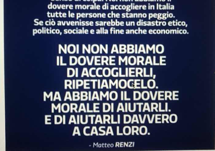 Davvero inopportune le esternazioni di Matteo Renzi che ha riciclato slogan propri dell'estrema destra piuttosto che di un segretario del Partito Democratico. 'Vorrei che ci liberassimo da una sorta di senso di colpa. Noi non abbiamo il dovere morale di accogliere in Italia tutte le persone che stanno peggio. Se ciò avvenisse sarebbe un disastro etico, politico, sociale e alla fine anche economico. Noi non abbiamo il dovere morale di accoglierli, ripetiamocelo. Ma abbiamo il dovere morale di aiutarli. E di aiutarli davvero a casa loro”.