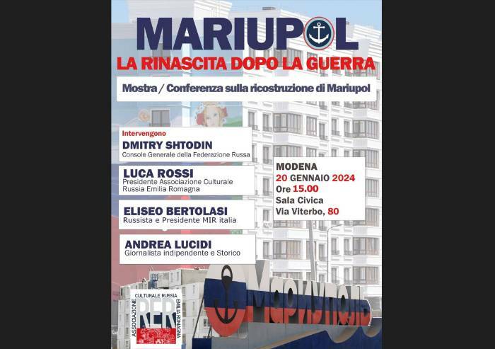 'Mariupol, città-simbolo della rivolta popolare del Donbass contro la giunta di Kiev, città martire dell'occupazione banderista durata 8 anni, affronta ora un veloce processo di ricostruzione sotto l'egida delle Istituzioni della Federazione Russia di cui è divenuta parte integrante - spiegano gli organizzatori -. L'Associazione promuove una mostra-conferenza per presentare al pubblico modenese i risultati della nuova amministrazione cittadina dopo la liberazione definitiva nella primavera del 2022, con la resa del battaglione Azov asserragliato nell'acciaieria 'Azovstal'. Parteciperanno in qualità di relatori della conferenza il Presidente dell'Associazione Luca Rossi, il Console Generale della Federazione Russa Dmitry Shtodin, il rappresentanteitaliano del Movimento Internazionale dei Russofili (MIR) Eliseo Bertolasi e il giornalista indipendente Andrea Lucidi'.