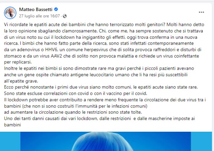 'Vi ricordate le epatiti acute dei bambini che hanno terrorizzato molti genitori? Molti hanno detto la loro opinione sbagliando clamorosamente. Chi, come me, ha sempre sostenuto che si trattava di un virus noto su cui il lockdown ha ingigantito gli effetti, oggi trova conferma in una nuova ricerca. I bimbi che hanno fatto parte della ricerca, sono stati infettati contemporaneamente da un adenovirus o HHV6, un comune herpesvirus che di solita provoca raffreddori e disturbi di stomaco e da un virus AAV2 che di solito non provoca malattia e richiede un virus coinfettante per replicarsi'. A parlare in questi termini è stato Matteo Bassetti in un post, passato inosservato, dei giorni scorsi (foto sotto).