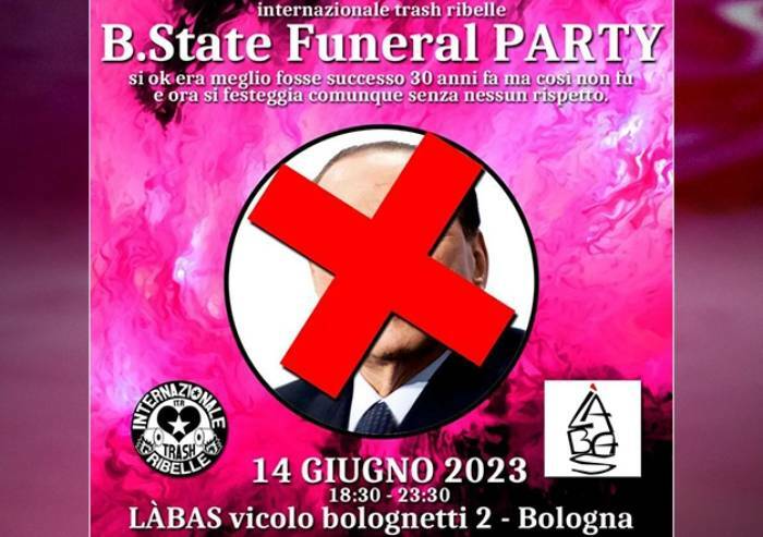 Non c'è limite alla vergogna. In vicolo Bolognetti, locali del Comune dove ha sede Labas, stasera si svolgerà una festa per festeggiare la morte di Berlusconi. 'B. State funeral party' il titolo della iniziativa che ha come sottotitolo 'Sì ok era meglio se fosse successo 30 anni fa ma così non fu. E ora si festeggia comunque senza nessun rispetto'.