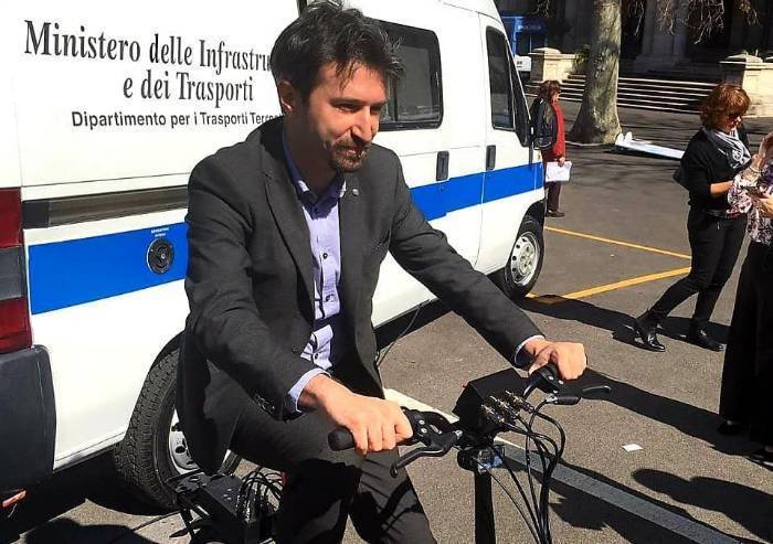Nella foto l'ex sottosegretario M5S Dell'Orco, famosa la sua biciclettata contro la Bretella. La stessa infrastruttura alla quale dal Ministero di Toninelli diede il via libera
