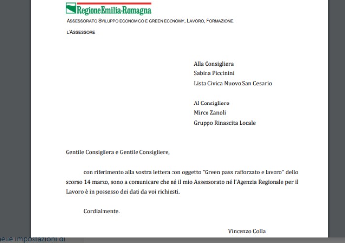 La Regione Emilia Romagna non è a conoscenza di quante siano le persone sospese dal lavoro e senza stipendio nei settori pubblico e privato per mancanza di green pass rafforzato. A certificare questo vuoto totale rispetto al diritto al lavoro di migliaia di cittadini emiliano romagnoli, è lo stesso assessore regionale al lavoro Vincenzo Colla in una risposta scritta data a due consiglieri modenesi, Sabina Piccinini e Mirco Zanoli di San Cesario.