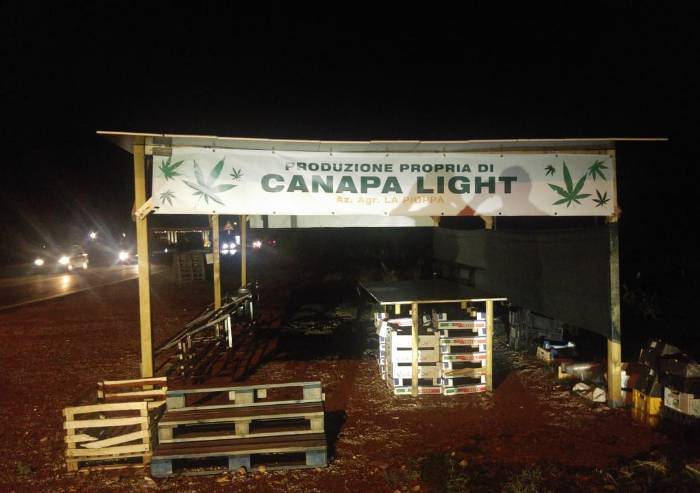 'Canapa light produzione propria'. Il cartello con tanto di chioschetto è comparso in questi giorni sulla Vignolese a Modena, a poche centinaia di metri dal grappolone.