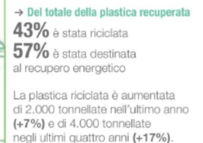 In sintesi la plastica da raccolta differenziata va per il 57% agli inceneritori e per il 43% effettivamente al riciclaggio di materia. Agli inceneritori va anche tutta la plastica della raccolta indifferenziata, come giocattoli e posate di plastica...