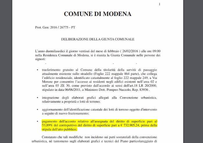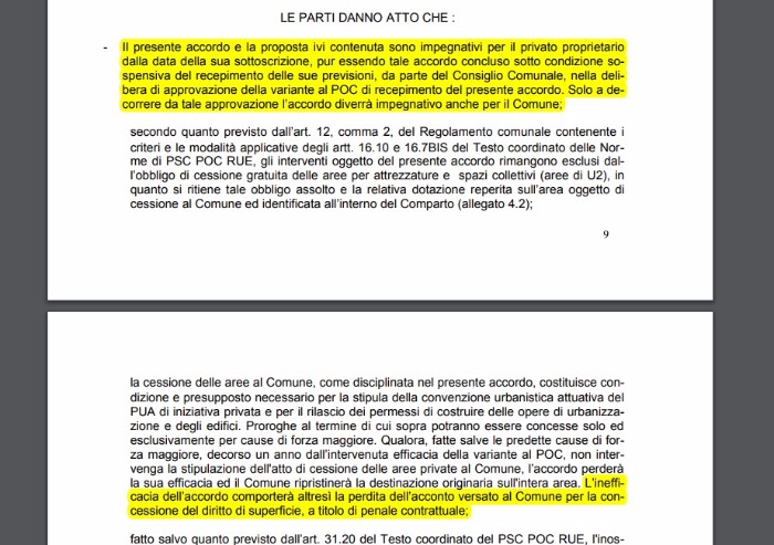 Recita, infatti, il documento: 'Il presente accordo e la proposta ivi contenuta sono impegnativi per il privato proprietario dalla data della sua sottoscrizione, pur essendo tale accordo concluso sotto condizione sospensiva del recepimento delle sue previsioni, da parte del Consiglio Comunale, nella delibera di approvazione della variante al POC di recepimento del presente accordo. Solo a decorrere da tale approvazione l’accordo diverrà impegnativo anche per il Comune'.