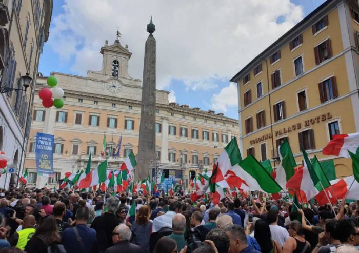 “In nome del popolo sovrano, elezioni subito”. Lo chiedono i manifestanti riuniti a piazza Montecitorio – ormai piena così come le vie limitrofe – giunti per protestare contro la fiducia al governo Conte bis oggi alla Camera.