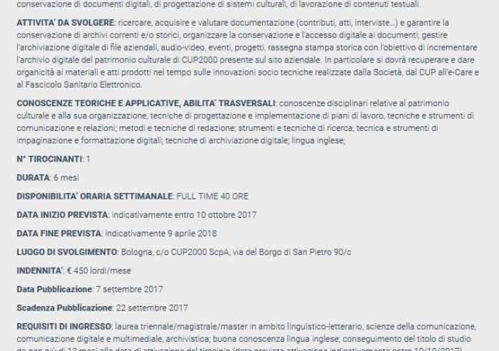 La denuncia è di Brugnara, SI: Cup2000, società a capitale interamente pubblico propone attraverso un bando un tirocinio per la gestione del patrimonio culturale. Il bando offre a un laureato, con buona conoscenza della lingua inglese, 450 euro al mese ?lordi per sei mesi di tirocinio, lavorando ovviamente 40 ore a settimana. In pratica 2,70 euro all'ora lordi