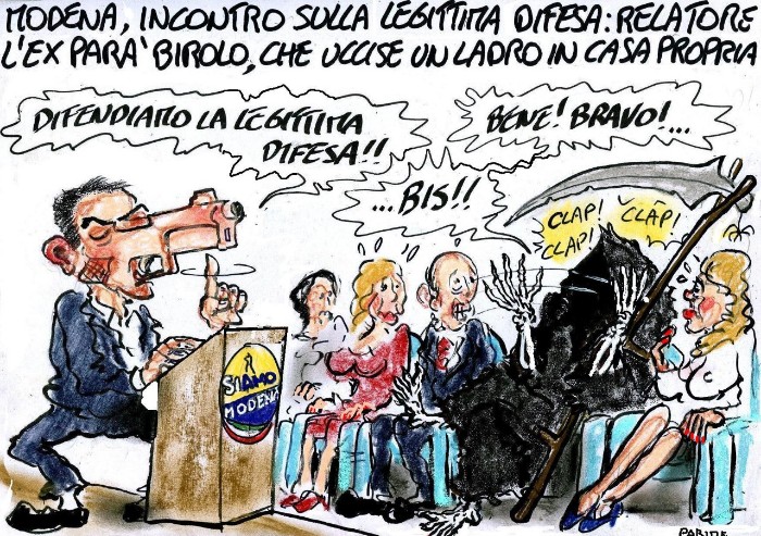 “Vignetta inaccettabile, che nulla ha a che fare con il legittimo diritto di satira e di critica”. Così commenta l’avvocato Elisabetta Aldrovandi, presidente dell’Osservatorio Nazionale Sostegno Vittime, in merito alla vignetta pubblicata su La Pressa, quotidiano modenese on line, relativa alla serata con il candidato sindaco della Lega Stefano Prampolini (nella foto la Aldrovandi con Salvini), tenutasi sul disegno di legge di modifica della legittima difesa, alla quale ha partecipato, tra gli altri, Franco Birolo, il tabaccaio veneto processato per tre gradi di giudizio per omicidio colposo e poi assolto, per essersi difeso da un rapinatore entrato nel suo negozio, che stava per colpirlo con il registratore di cassa. In questa vignetta, Birolo viene rappresentato con una pistola al posto del naso e tra il pubblico è rappresentata la morte che applaude.