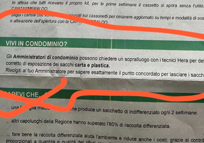 Ancora segnalazioni relative a cumuli di rifiuti a Modena. La foto sopra si riferisce alla situazione di oggi in via Spallanzani: ovunque sacchi dell'immondizia accanto ai nuovi cassonetti installati da Hera. E proprio Hera, come dimostra la foto sotto, ai residenti nei condomini ha inviato una lettera per fare chiarezza anche sul luogo dove lasciare i sacchi di carta e plastica. Spesso il luogo indicato incredibilmente è, come pubblicammo nelle settimane scorse, nelle aiuole pubbliche, ma in ogni caso la multiutility rimanda all'amministratore di condominio il compito di dare indicazione sul punto concordato. Una responsabilità che, ovviamente, molti amministratori lamentano di non potersi assumere vista la scelta di alcuni residenti di non fornire l'accesso ai cortili interni per comprensibili ragioni di sicurezza.