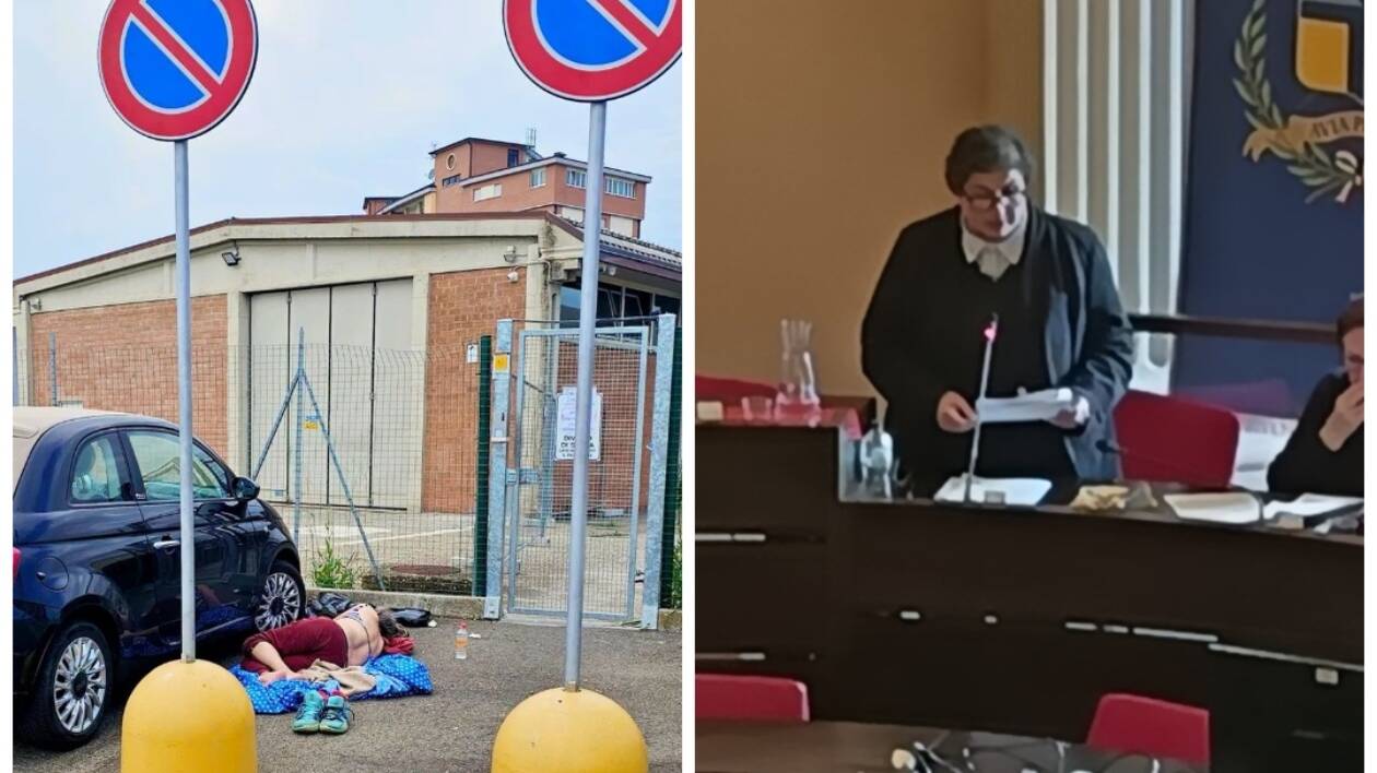 Nella foto, a destra, l'Assessore Maletti in consiglio comunale oggi e, a sinistra, un bivacco davanti al drop-in, sabato pomeriggio, poche ore dopo la visita dei consiglieri comunali