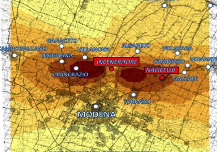'Le emissioni in atmosfera delle Fonderie (centinaia di migliaia di metri cubi/anno) si “sommerebbero” a quelle dell’inceneritore di Modena che già da solo genera oltre un miliardo di metri cubi/anno di emissioni inquinanti: circa 150.000 metri cubi/ora ogni giorno. Sono già note le conseguenze negative sulla salute provocate dalle emissioni dell’inceneritore, purtroppo, e non ci sembra il caso di aggiungerne altre (vedi cartina ndr) - affermano i comitati -. A Navicello sono già presenti due aziende di zincatura, catalogate al pari delle fonderie come “aziende insalubri“, oltre agli effluvi delle discariche limitrofe che il vento concentra nella medesima zona. L’accumulo degli inquinanti determinerebbe anche un micidiale effetto “cocktail” di molecole organiche/inorganiche differenti fra loro e dannose per la salute dell’uomo e la qualità dell’ambiente. Inoltre in contraddizione con il principio di “consumo zero” del territorio previsto dalle nuove normative Regionali e dal Comune di Modena, verrebbe cambiata la destinazione d’uso di oltre 40.000 metri quadrati di terreno da agricolo a industriale, stravolgendo in modo irreversibile la