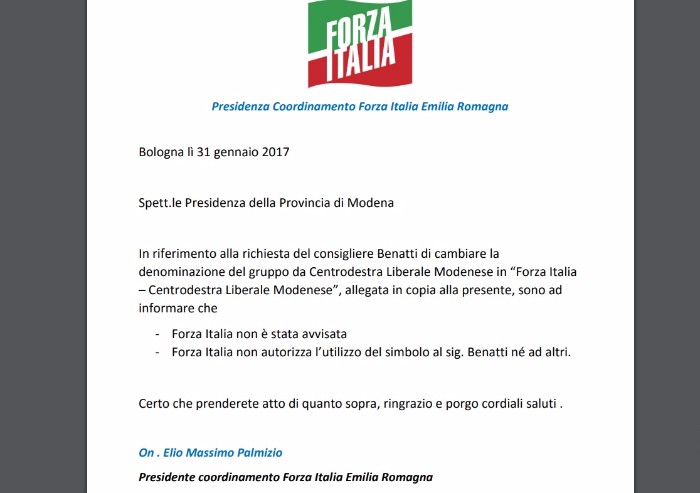 Era il 31 gennaio 2017 quando il segretario regionale di Forza Italia Massimo Palmizio scrisse una bella lettera al presidente della provincia di Modena Giancaro Muzzarelli per comunicare come il consigliere provinciale Roberto Benatti, storico leader di Forza Italia a Carpi, non fosse autorizzato a usare il logo del partito di Berlusconi.